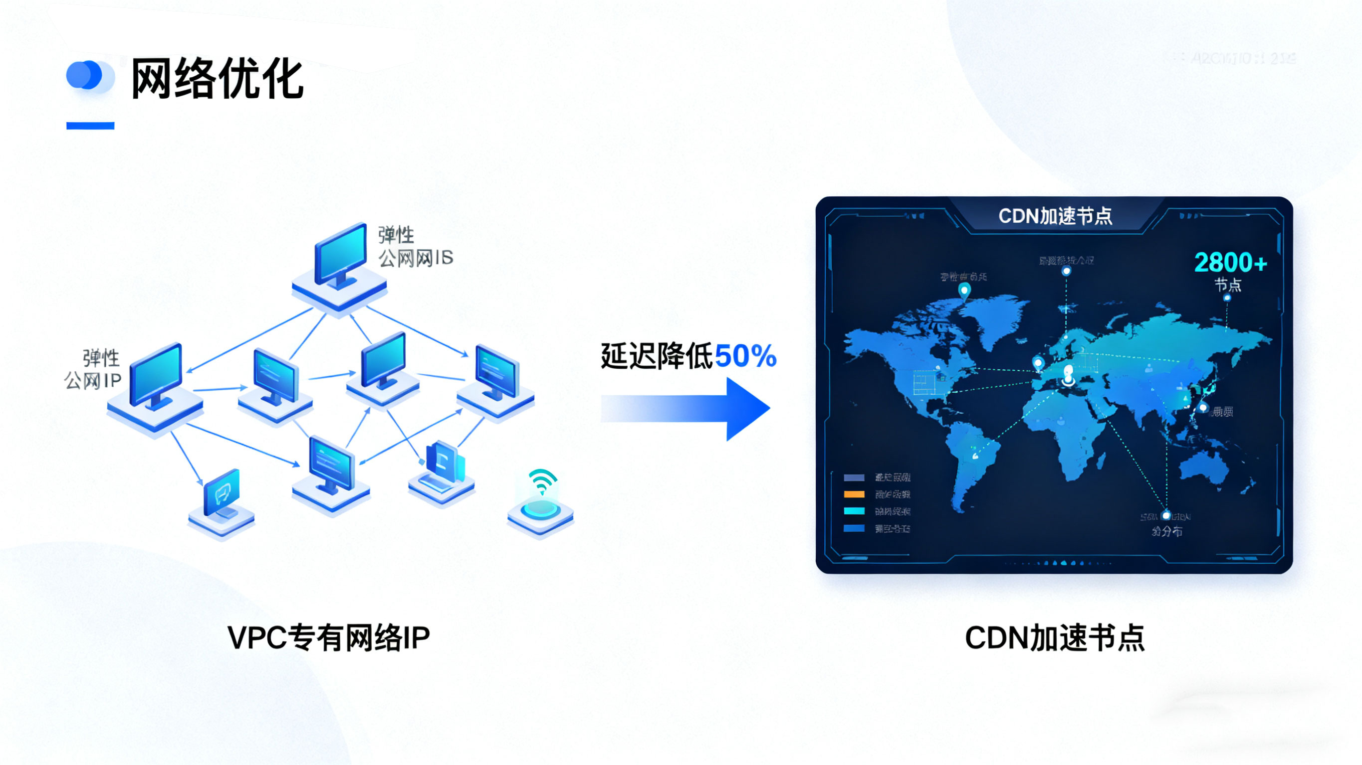 网络性能是影响应用访问速度的重要因素,阿里云服务器提供了多种网络优化方案。一是选择合适的网络类型,阿里云支持 “专有网络(VPC)” 和 “经典网络”,VPC 是隔离的网络环境,安全性和稳定性更高,建议所有用户优先使用 VPC;同时,可开启 “弹性公网 IP(EIP)”,实现公网 IP 与实例的解绑,方便实例迁移和故障恢复。二是优化带宽配置,对于流量波动较大的应用,推荐使用 “按流量计费” 的带宽模式,避免带宽闲置;对于对延迟要求高的应用(如游戏、实时通信),可选择阿里云的 “高速通道” 服务,建立企业本地数据中心与阿里云之间的专用网络连接,降低网络延迟。三是使用 CDN 加速,阿里云 CDN(内容分发网络)拥有全球 2800 + 加速节点,可将网站的静态资源缓存到就近的节点,用户访问时直接从节点获取资源,大幅降低网络延迟,提升访问速度。