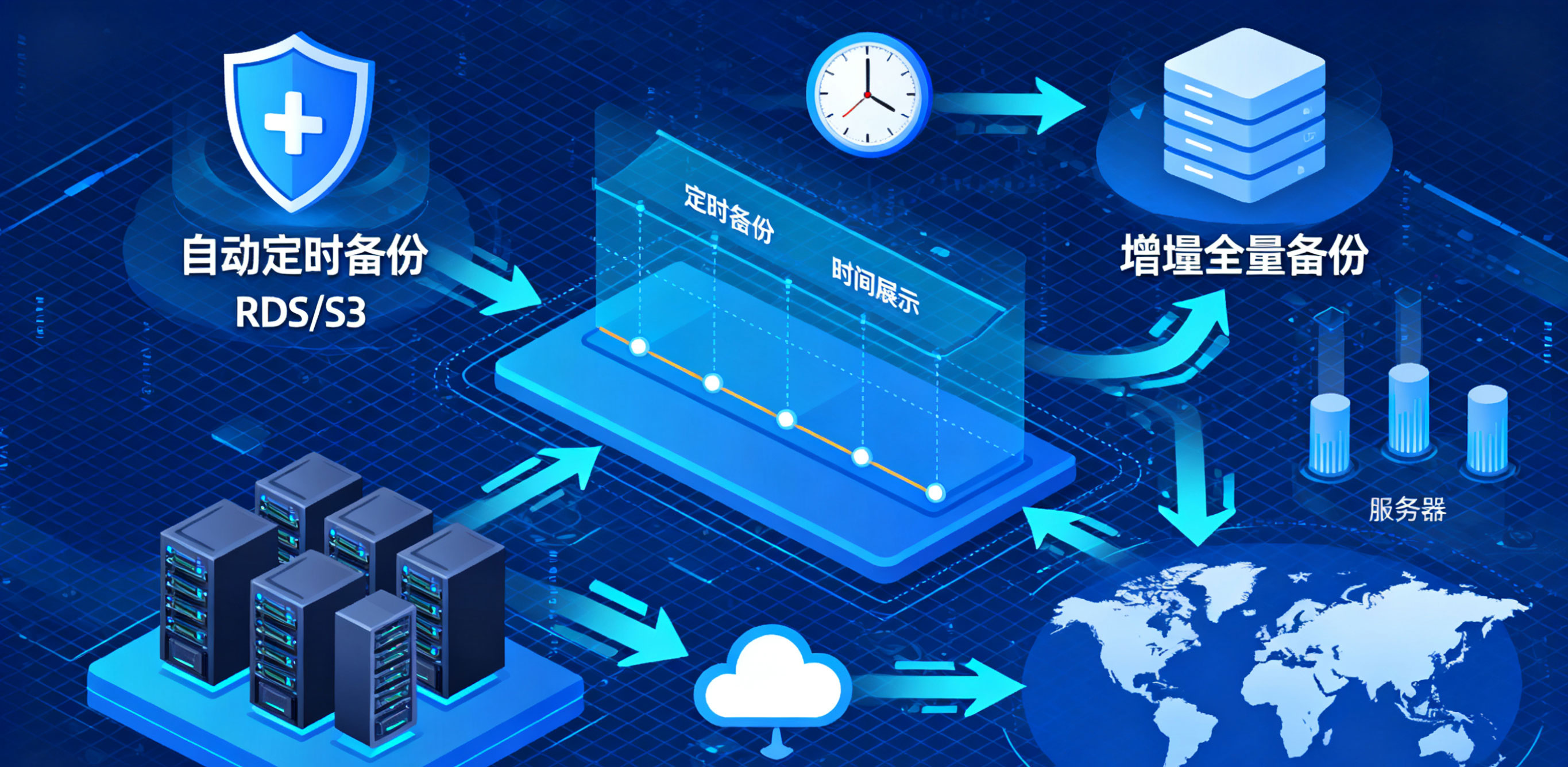 - 自动定时备份:RDS 数据库支持按 “小时 / 天 / 周” 自动备份,备份数据存储在 S3 归档存储,保留周期可设 1-35 天;某金融企业设置每日凌晨备份,搭配 “跨区域复制”,即使本地数据损坏,跨区域备份可快速启用,数据安全性提升 99.99%。